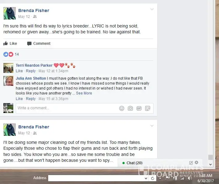 Brenda Fisher is not only known as a lover to the serial killer Charles Manson but several of her animals she has physically abused and verbally abuse along with posting on face book about other people dogs. Here shows just how she failed to train a Pomeranian purchased from Webster Florida breeder Lacey Leigh Burton she later blames this breeder for neglecting to train and keeping animals stuck in cages all day for Lyrics pooping problems inside her cage when she becomes frustrated in training Lyric and ended up rehoming the dog as she claims with Tabitha Corkern known face book name now as Tabitha Wakefield any person that post these type defamation post about a dog really don't deserve to even own a dog to begin with her own failure to train Lyric was her own fault, this dog is just a puppy. It's a good thing Tabitha rehome Lyric, she probably end up dead like poor Buttons from over medicating drugs to sedate the dog into laying motionless like a stuff animal, Screen Shots show be on a doubt this person is a extreme narcissistic sociopath animal abuser