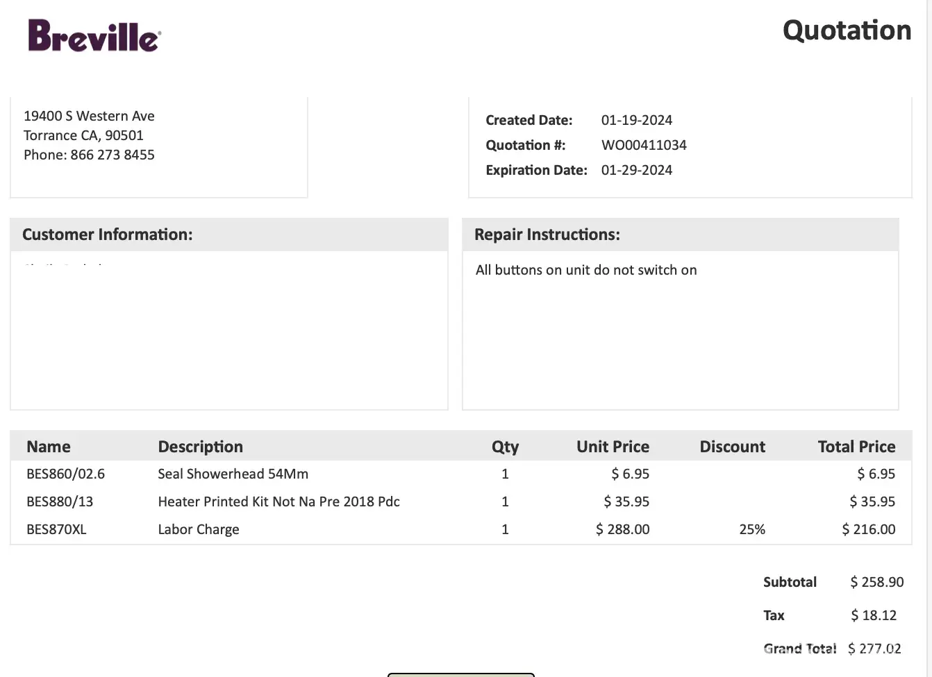 -no one from Breville initiates a call to keep you informed