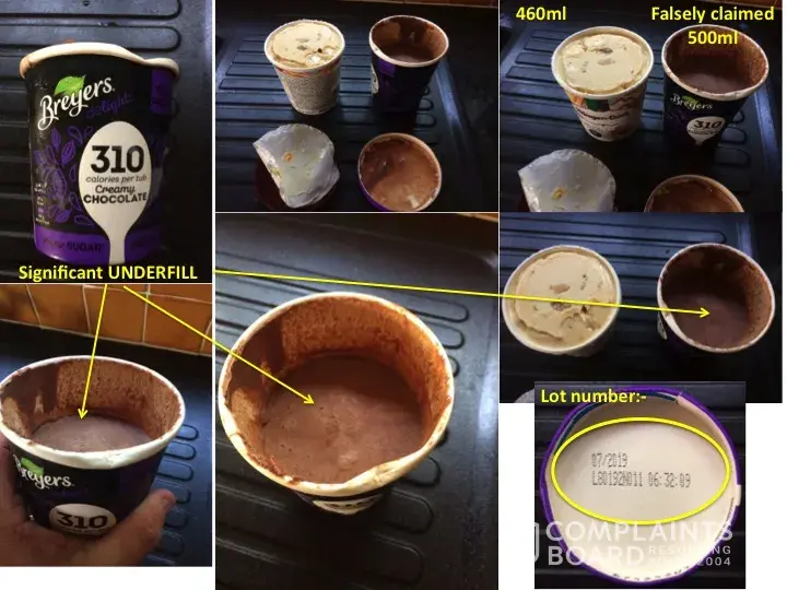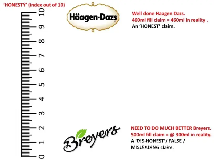 I bought x2 tubs of ice cream, which my wife and I regularly do (1) haagen dazs 460ml as well as (2) the offending breyer 500ml (falsely claimed fill product). The attached document shows what transpired when opening both packs.