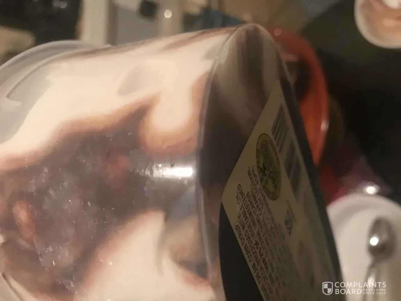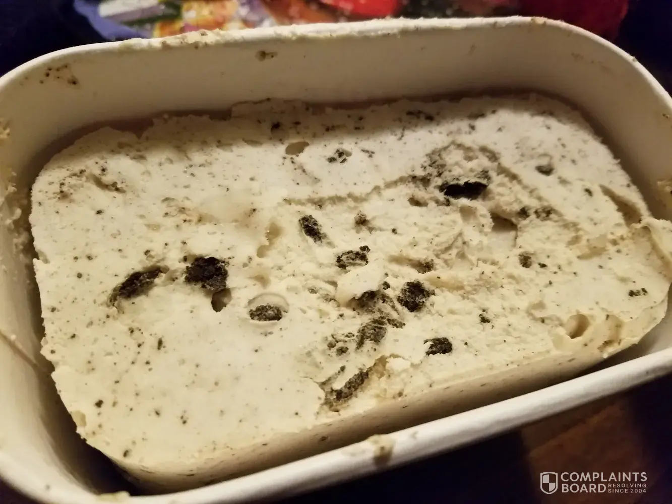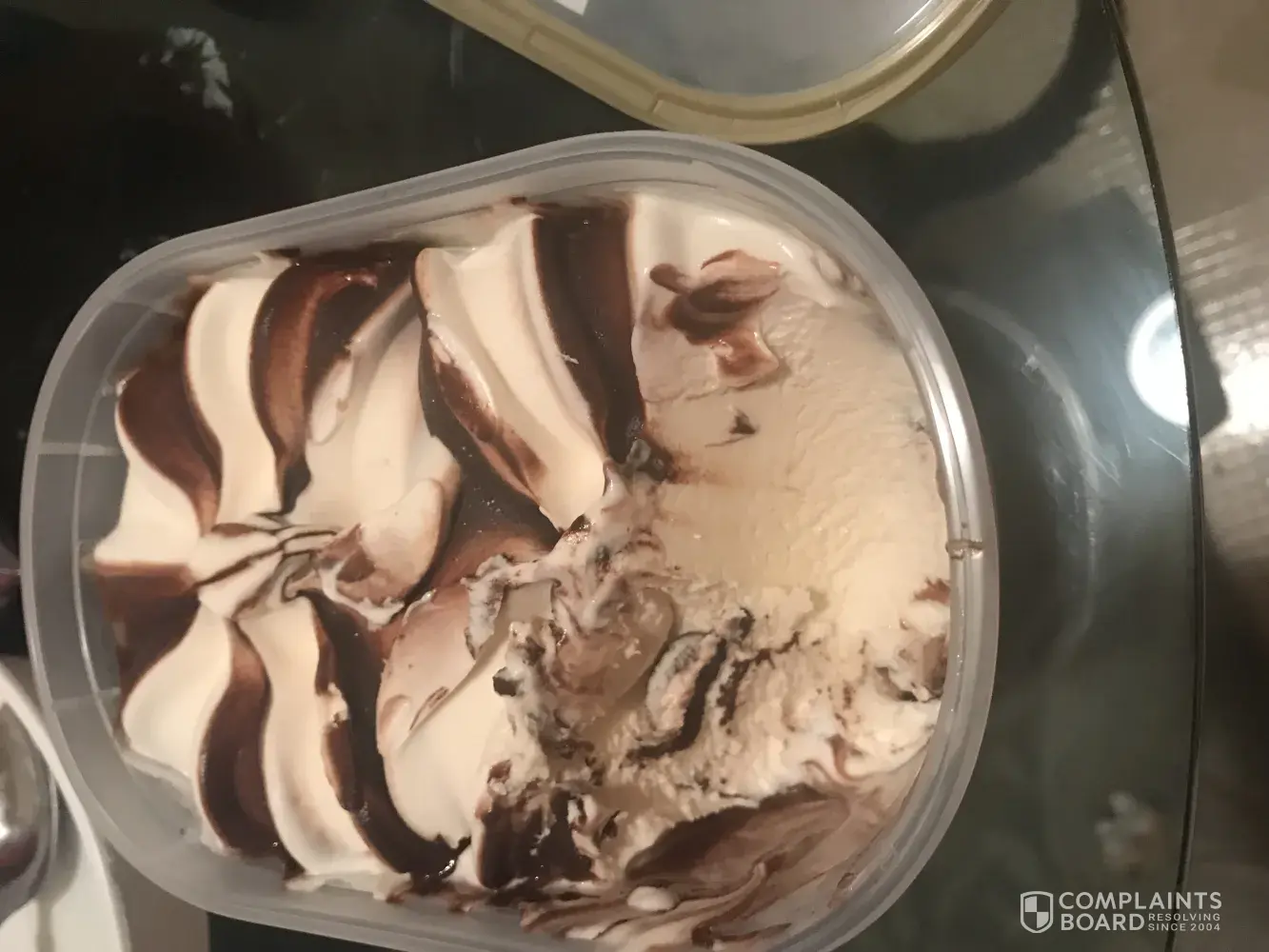 The ice cream tub was about half gone when I purchased it. There where large amounts of ice cream missing from the edges, and the top of the container. To top off my purchase the tub was also complete freezer burnt as soon as I brought it home, as I opened it right away. I normally purchase Breyers ice cream as it is a family favourite around my house, however, I have not bought Breyers ice cream since my experience. I do not know what happened to your quality control.