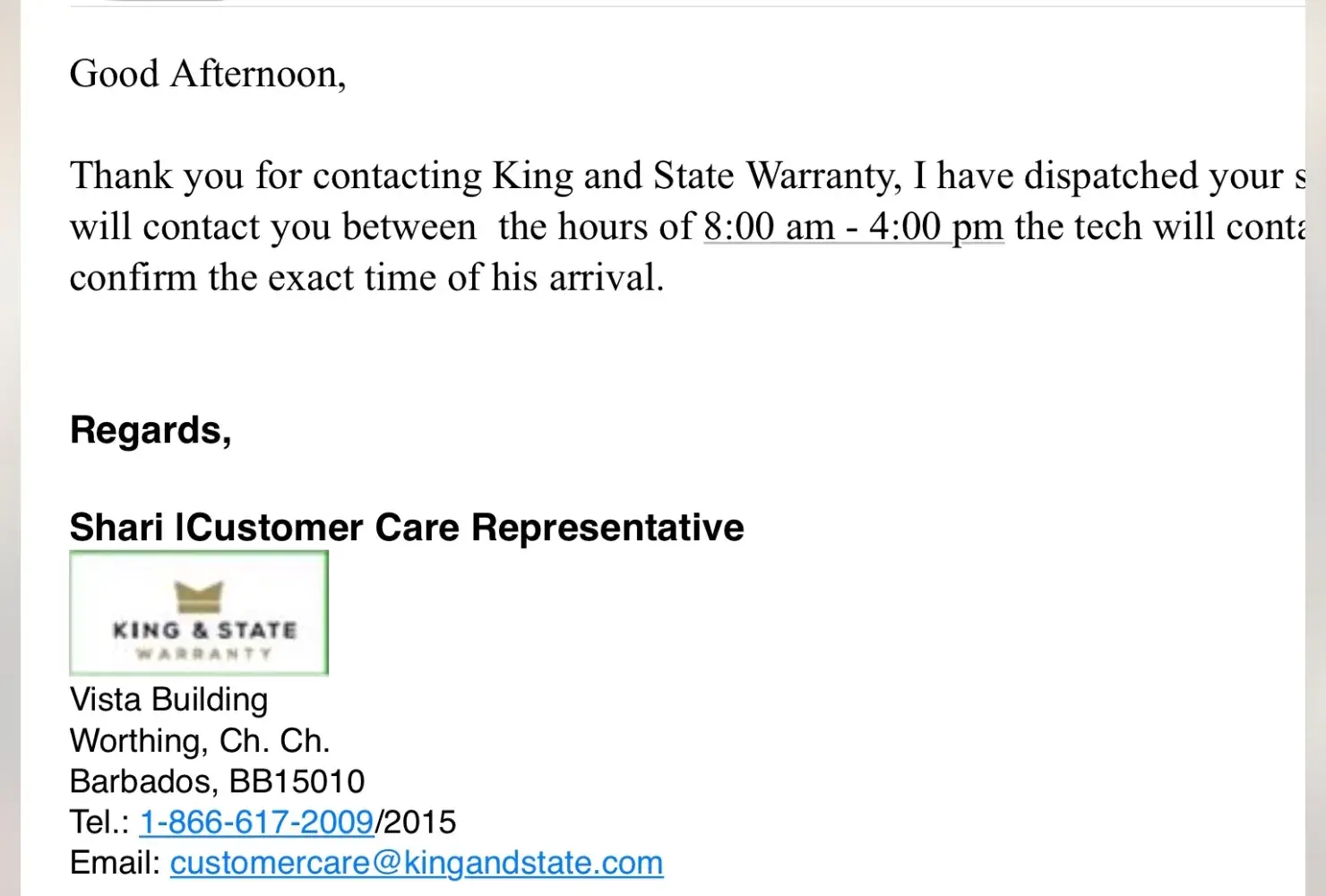So we found the number for King & State and spent the remainder of the day on hold (calling non-stop between 10am to 4pm EST), and their automated system would keep us on hold for nearly a half hour, then say to leave a message for callback. However, this was followed by a message that the voicemail was full, and then the call would disconnect. She tried for TWO DAYS with the same results. I even sent an email (and a second follow-up email) on her behalf, and did not receive a response until FIVE days later, and from Barbados.