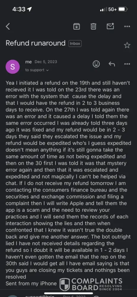 I enrolled in the Bright+ monthly service, which would mean I get billed December 08. Instead, I get charged an annual fee of $83.33 21 days after I initially signed up. Seeing that this was a mistake I tried to get in touch with a representative to get a refund. I figured it wouldn’t be an issue because Bright+ advertises 24/7 assistance. What they DONT tell you is that the “assistance†is just a bot that doesn’t even really help you. I spent 45 minutes trying to get in touch with someone over the phone before leaving an email and giving up. I want my money back, and I want my subscription cancelled. This experience left a sour taste in my mouth and I won’t ever recommend this app to anyone, since your customer service is left in the hands of an automated bot system that does nothing for you UPDATE: Even worse still. Your instant withdrawal is on the fritz. I was told it was a known issue and that there was no ETA as to when it would be fixed? You’re joking right? You guys come up with all these fancy updates but you can’t fix a key feature like instant money withdrawal? I’ve had the worst experience with Bright…I’m glad I deleted my account and I will never trust this service again. UPDATE: EVEN WORSE STILL I CANT EVEN DELETE MY ACCOUNT! IM SO SICK OF THIS!