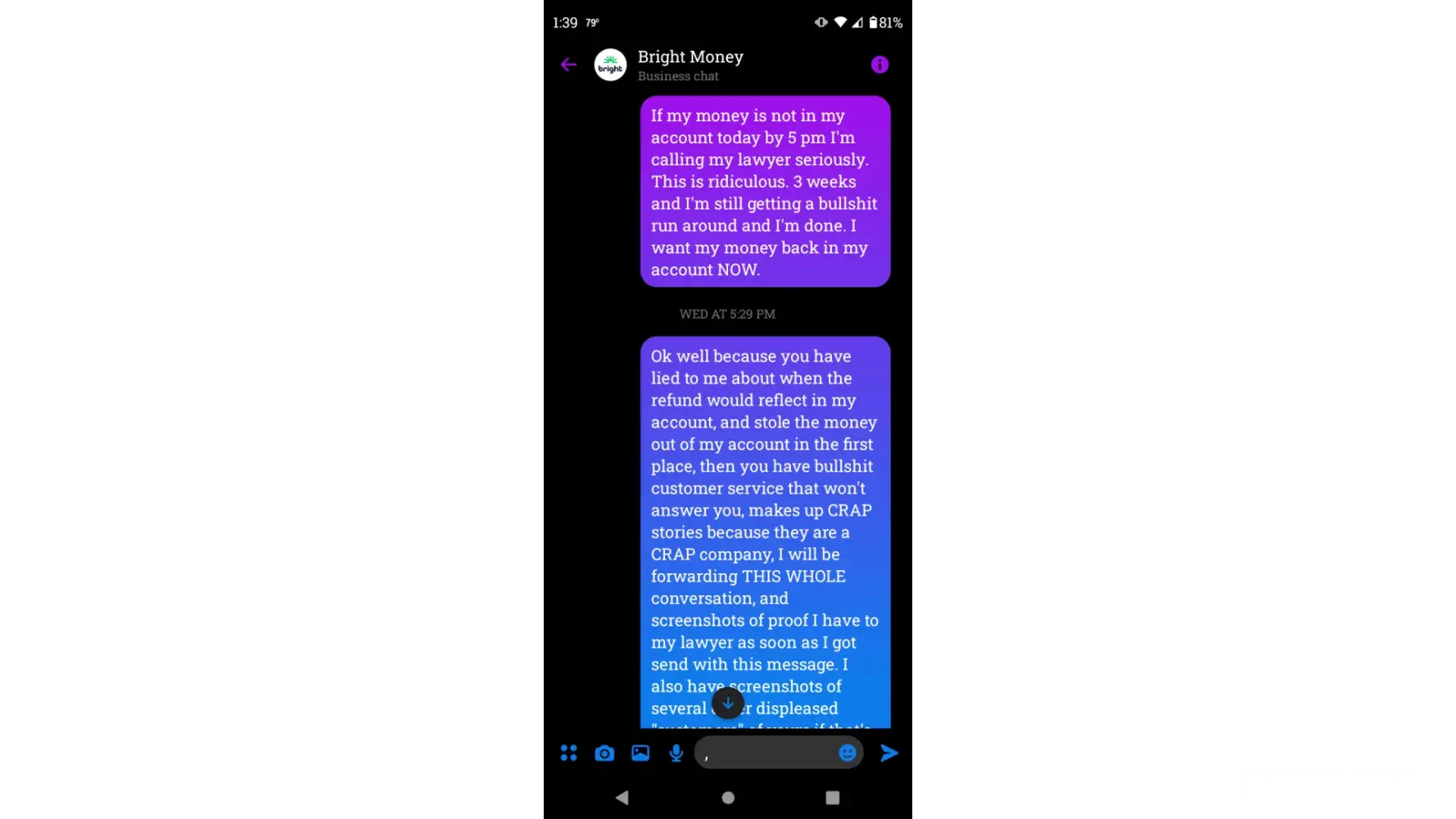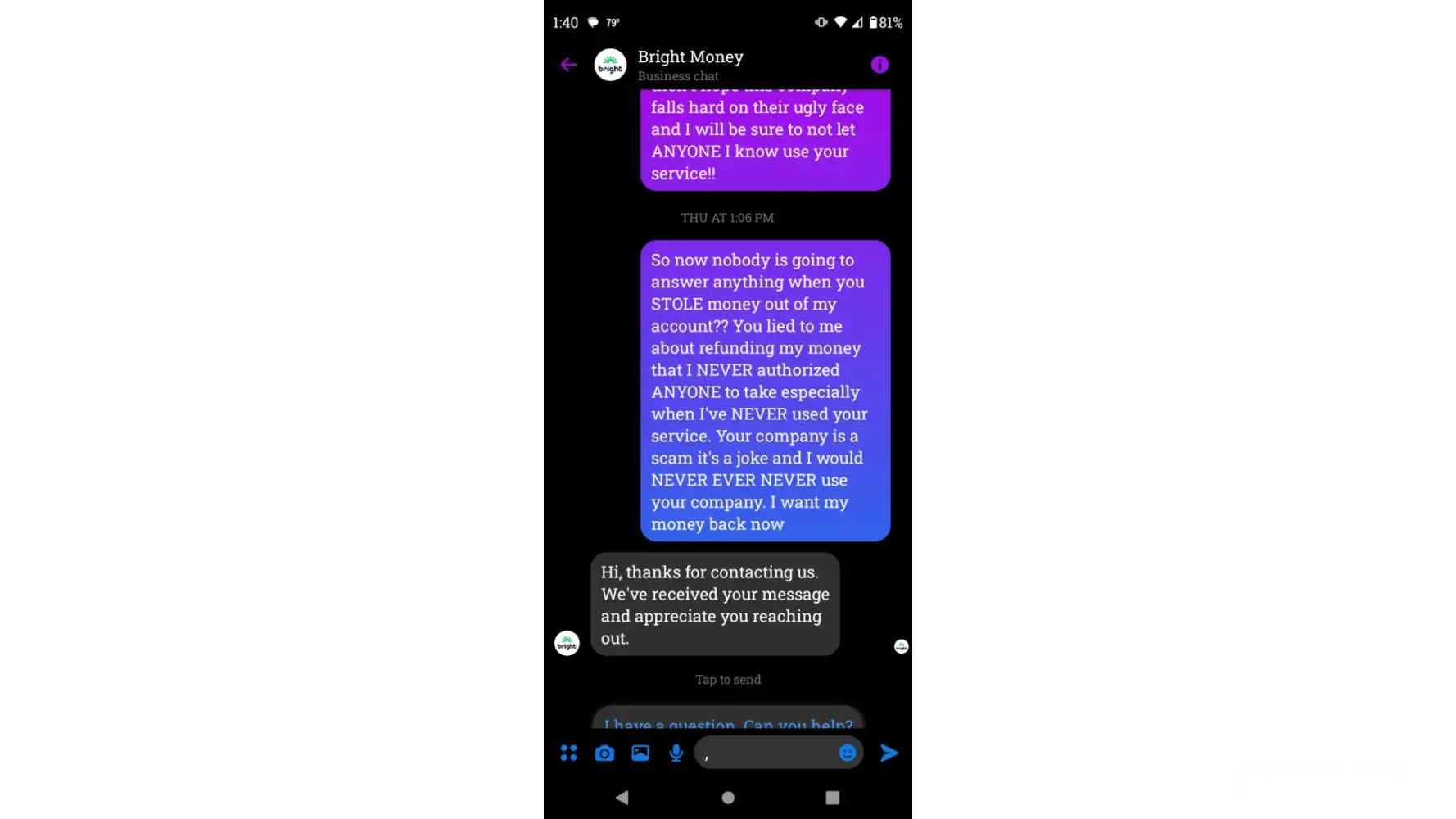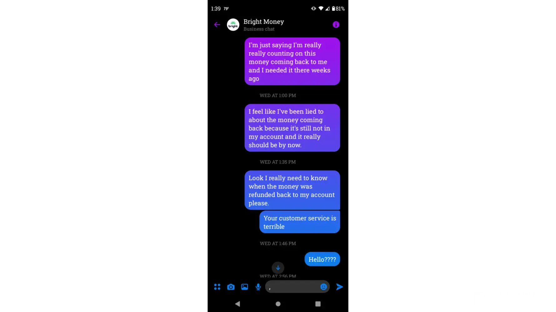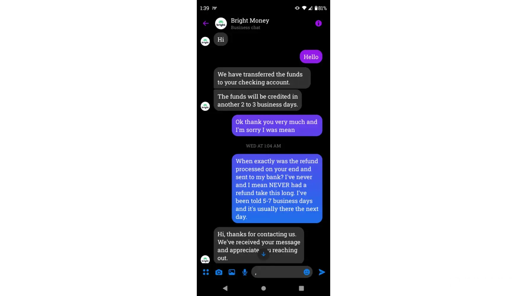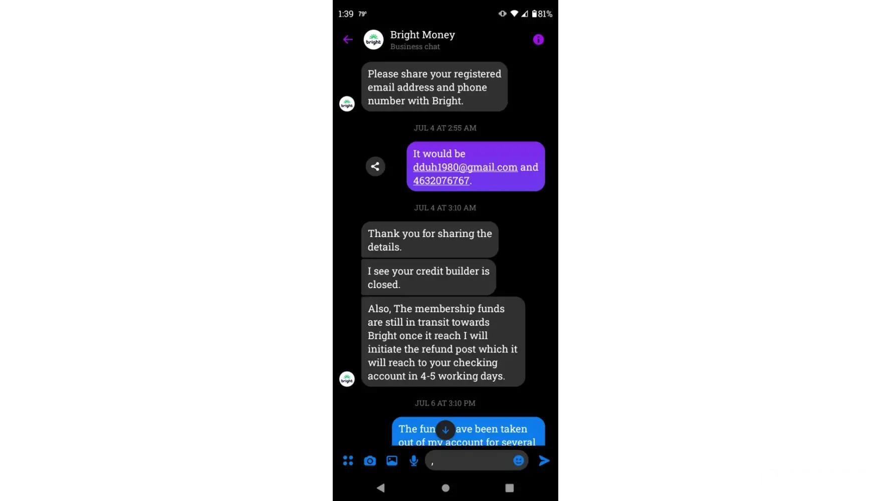 3 weeks ago bright m9ney took money from my account . I did not sign up for this. I emailed 6 times for my 99.00 dollar refund. Every email is computer generated saying I will receive my refund in 3-4 days. I tried calling their phone number no answers and refers back to email them. Starting 4 week no refund no way to contact a human. This company is not user friendly and does not refund for services not rendered. All I want is my money back. I can see that this will never happen. Do Not Use this app