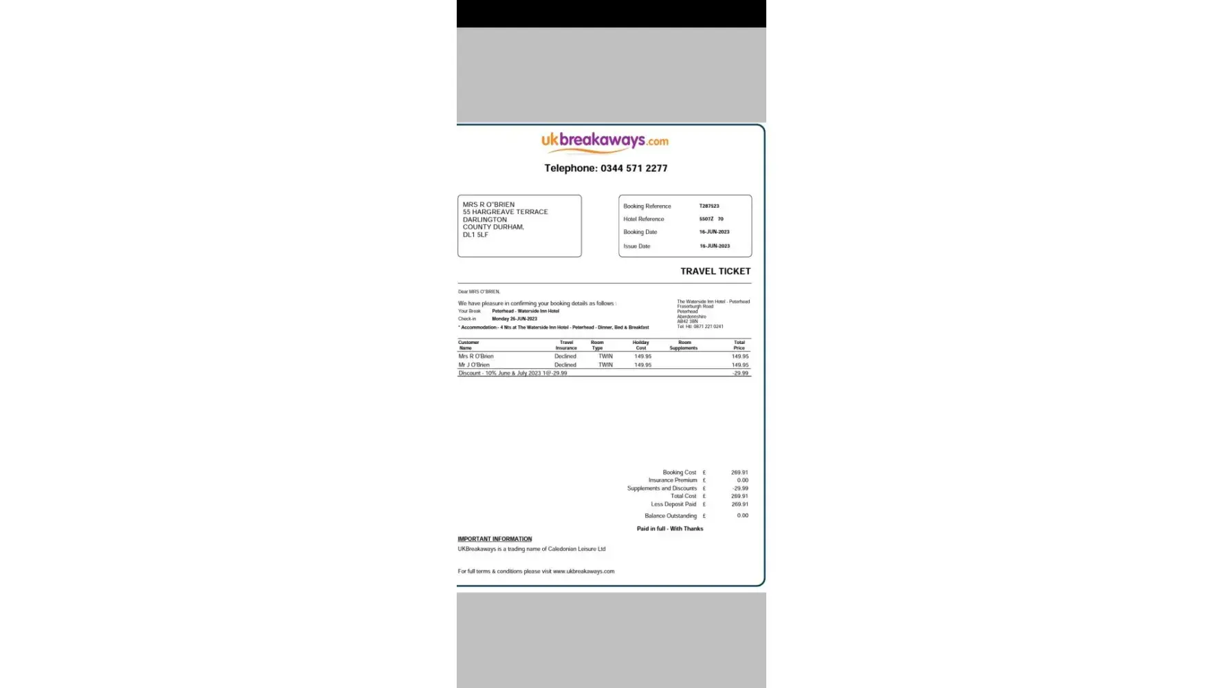 Booking Ref. T287523. Arrival 26 June, for 4 days/ 5 nights on Dinner, Bed & Breakfast.