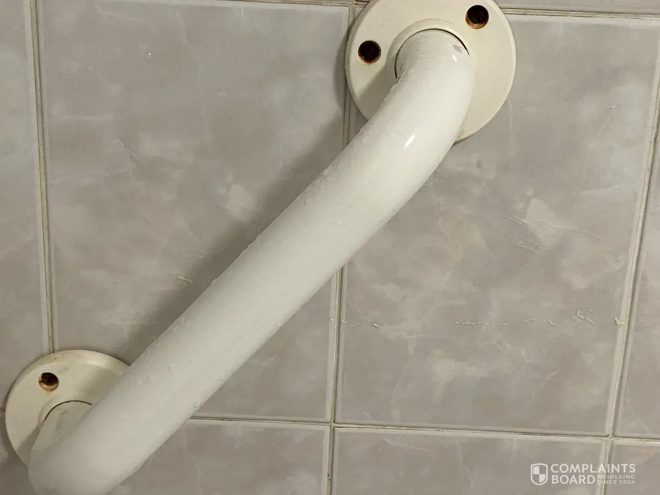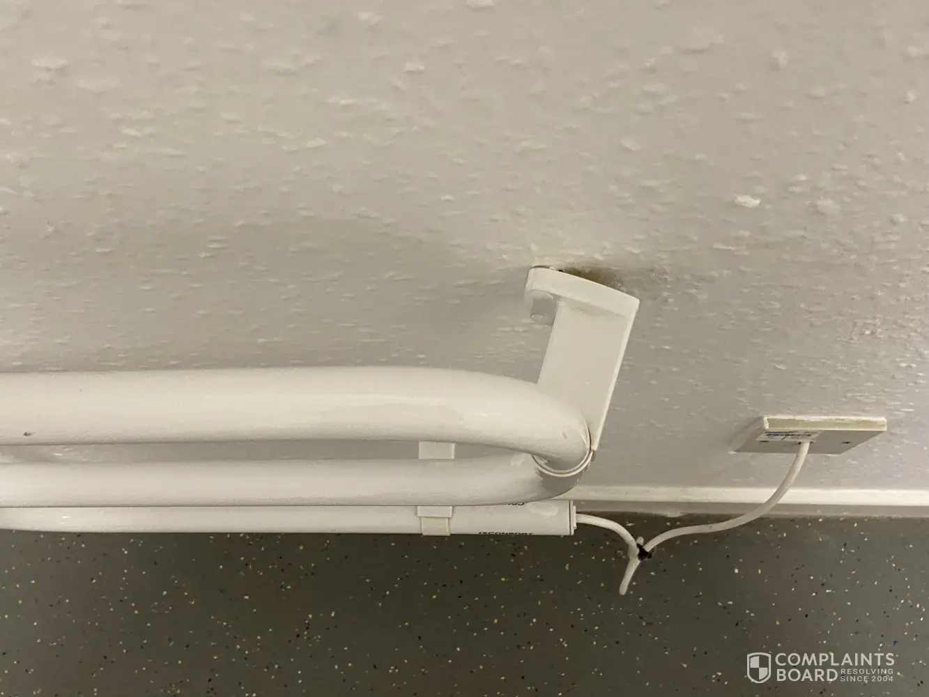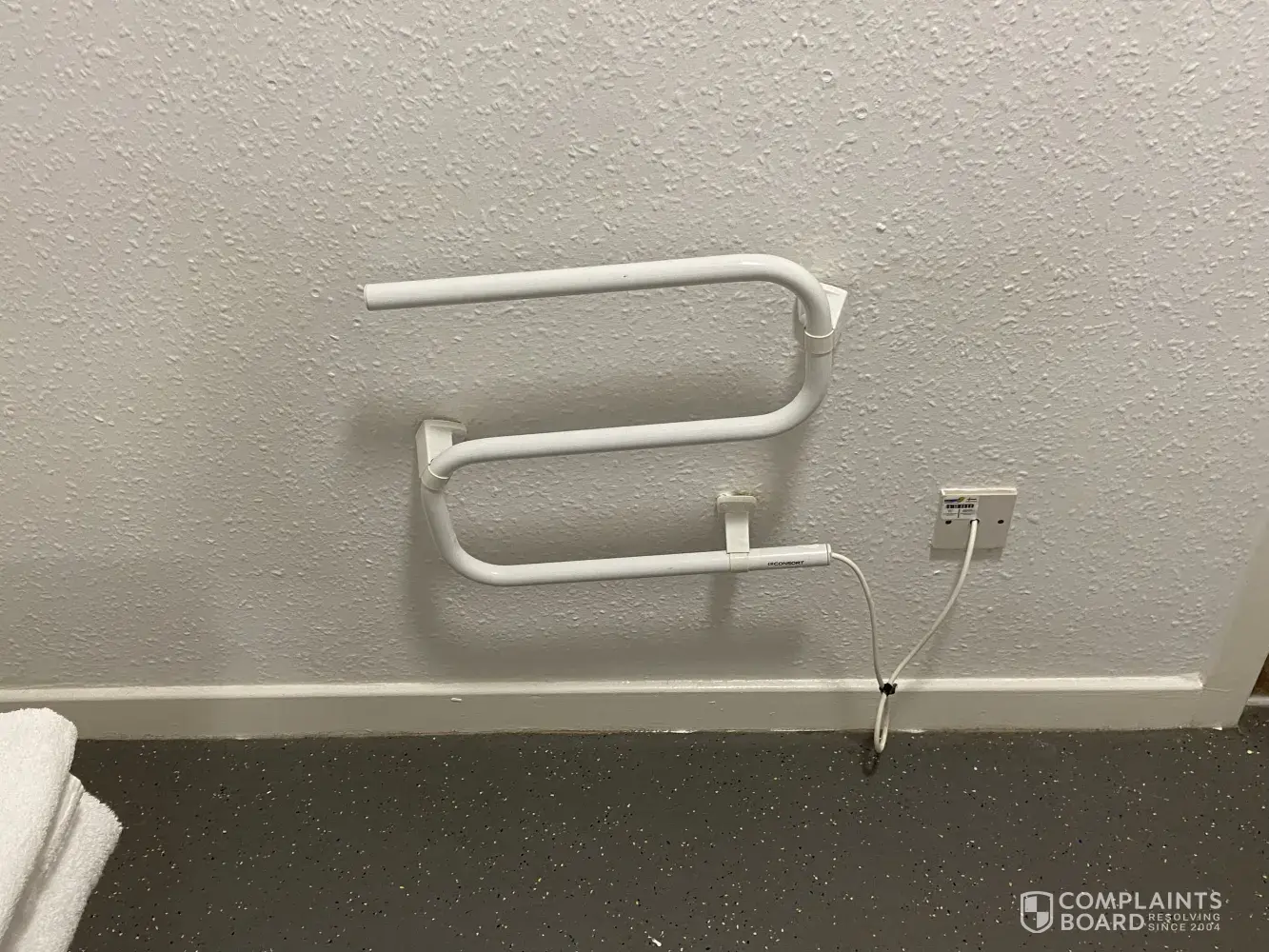 The heated towel rail in the bathroom was hanging off the wall