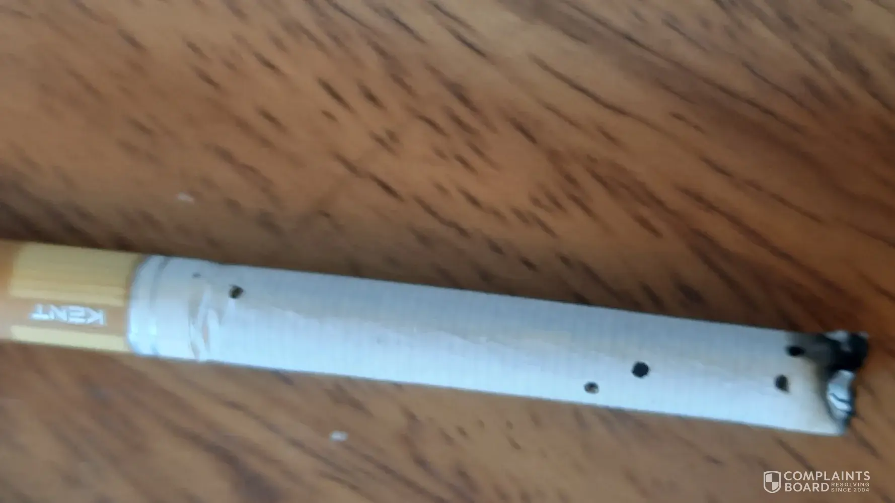 Please see attached photo of a cigarette from a packet bought yesterday 10 May 2021. There have been 3 cigarettes with holes in them.