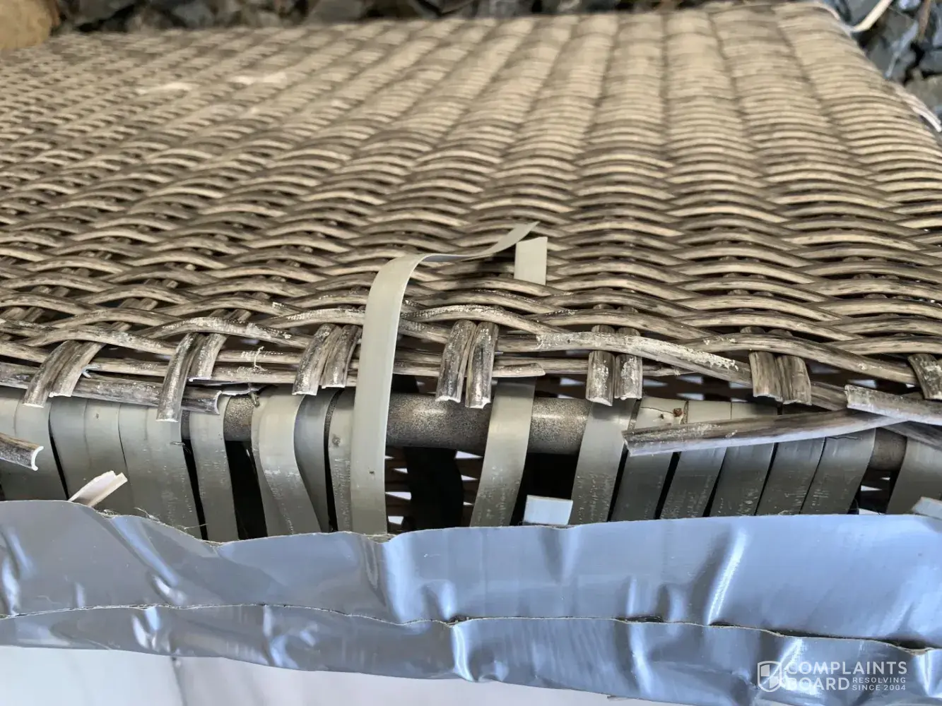 1. All 6 wicker backed chairs have varying levels of disintegration (brittle, dry breaking off to the touch) of the plastic wicker on the tops of each chair.