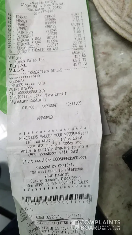 I contacted the HomeGoods store and spoke with a women named "Tish" at the Boca Raton FL location who told me she could not help me.