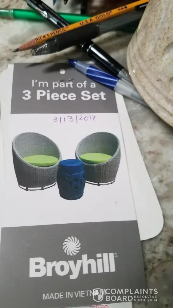 On February 27, 2017, I purchased a Broyhill 3 Piece Set, which includes 2 swivel chairs and a glass barrel side table. Info on page is as follows: Purchase price for set was $399. Dept: 16, PC0317 Style: 00142 Type: 6 Cat: 4655 PO: [protected] PAGE: 001 Line: 014 Color: Light Grey