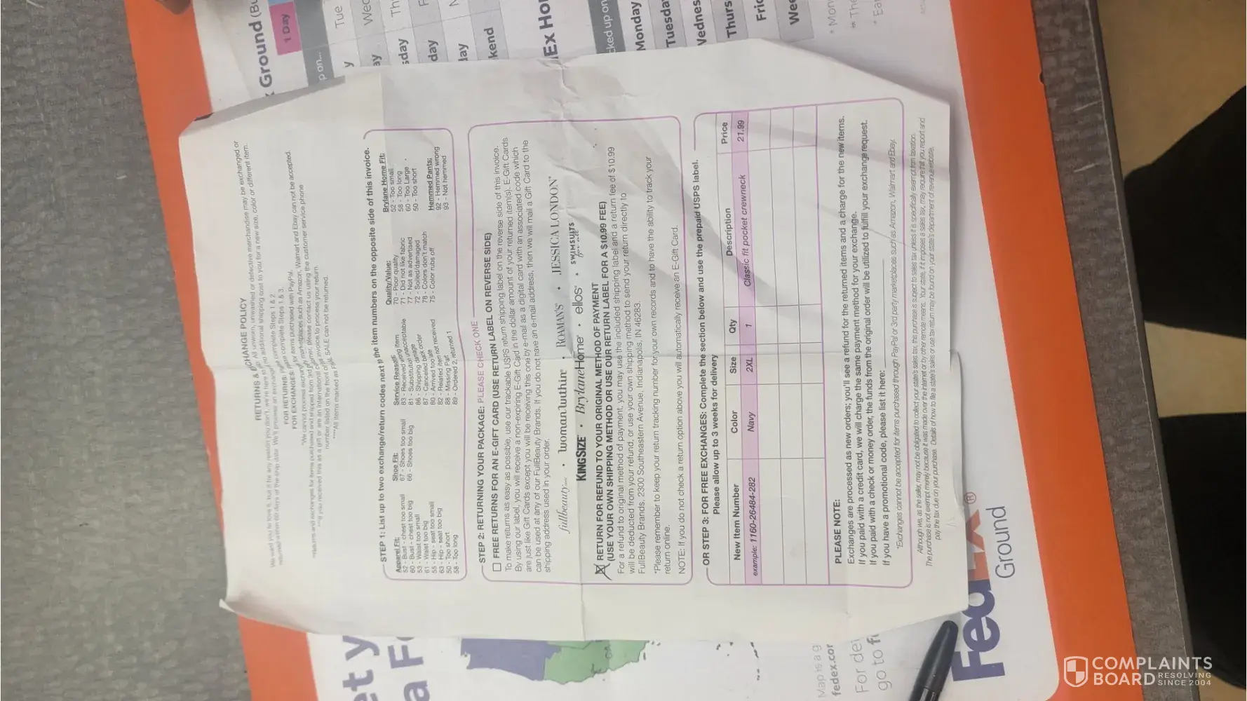 3. I called Customer Service at Brylane to find out about returning the chair. I spoke to a man who told me that I would need to disassemble the chair and repack it in the box it was shipped in and take it to a FedEx location for return. I asked if the return label covered the cost of the shipping. He said no, that the cost was my responsibility. (Please note that no other information was provided or offered.) So I checked with FedEx online to get the cost of shipping a box of this size and weight and they gave me a price of $70.00.