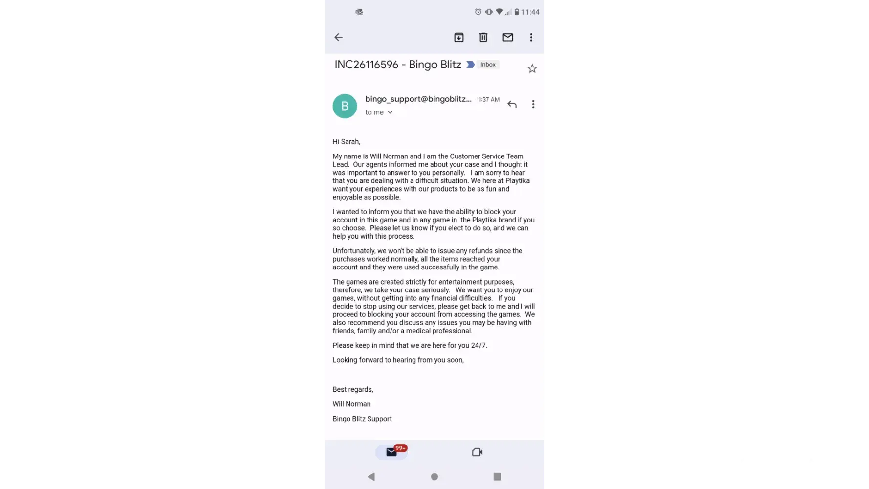 I have not played bingo blitz in months. I stopped because unless you purchase options in the game you can not progress. I made made a couple of 1 time purchases but never played for money or set up a gambling account. I found an unauthorized charge for $16 on my account today, August 20. I tried the phone number for Buffalo studios I found online but it is disconnected. I do not know what to add that would not include my bank information. I just want my money back and for this to not continue