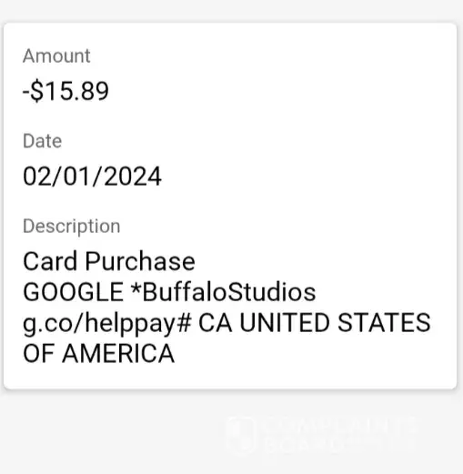 On Sept 5, 2022, 3:09pm pst, I checked my bank account and saw a charge for $16.30 under Buffalo Studios. It was started and completed today, 9.5.22. When I called the number along with it it was Google. I didn't even know who Buffalo Studios was until I looked them up a moment ago. Yes I have played Bingo Blitz but not in over a month and I also don't purchase items for that game. So I'm not sure why or how they charged me. I am also getting a hold of Google to dispute.