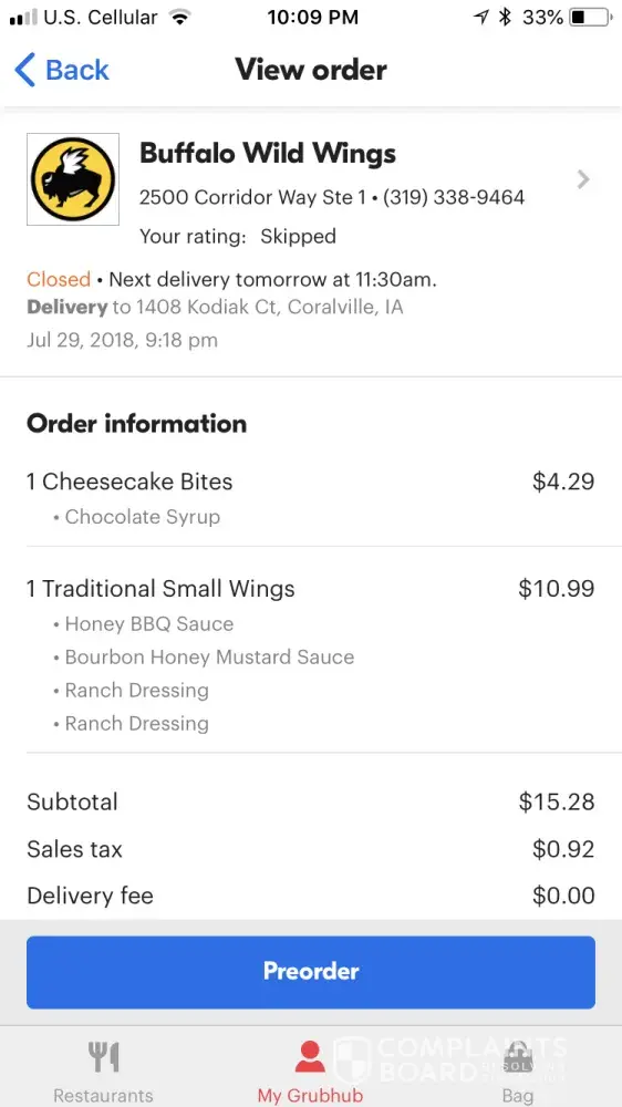At 9:18 PM on July 29th from your 2500 Corridor Way Ste 1 location in Coralville, IA, I ordered a small traditional wings with two sauces and got delivered what I ordered expect the wings were boneless. I never eat boneless and I feel like I have wasted my money. I used the GrubHub app and I received the order after the store had closed so I was unable to call in to the restaurant. Please refund me at least this order.