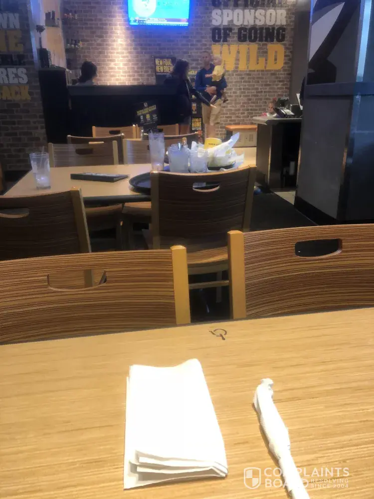On this day of April 27, 2018 my wife and I went to this Buffalo Wild Wings. We first walked into this building and saw a group of workers standing in the front area talking and what not, a young lady asked us if we preferred a table, booth or open seating. To which I responded and said "i'd like a table" so then she walked off and we never saw her again. Then a man walked up to us and asked the same exact question, and I said the same exact thing " a table please" then we waited for a good 10 minutes before getting seated, now take note this isn't a very busy time we went. There was a few people here and there but no where near busy what so ever. The table we were seated at was gross there was food all over it and the seats were wet they made very little effort to clean it for us. Then all the tables surrounding us were still dirty and had stuff on them. Anyways so we get seated and wait to be served and our server takes our drink order and disappears for about 10 minutes. We ordered water, then she took our food order we ordered a medium size of honey bbq and a large basket of fries to share. The food came out pretty fast but when we got it, all of it was cold the chicken was still very much frozen inside and the fries we cold and seemed to be old ones from earlier on that day. I must say that the staff there is very unprofessional and needs help.