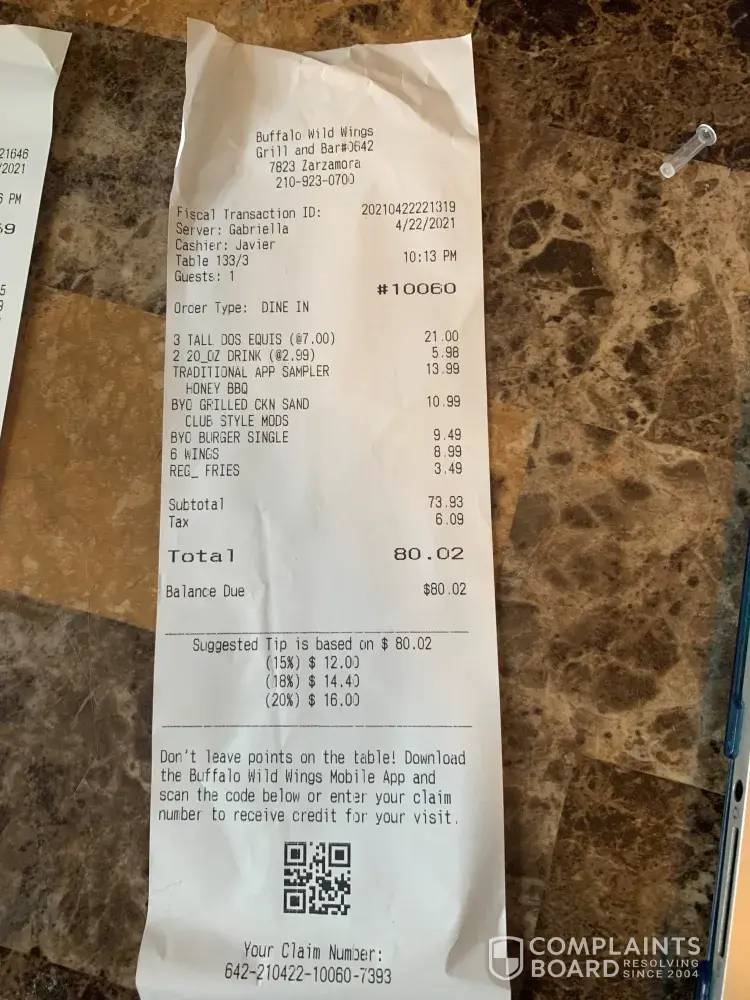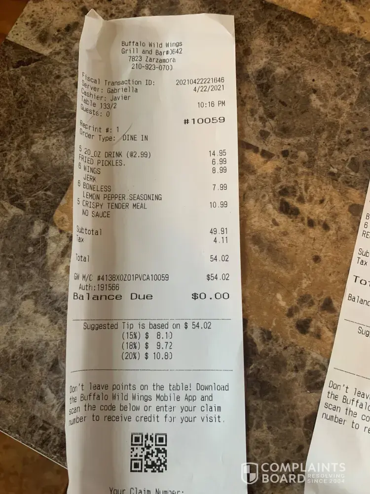 My family and I went to BWW at 7823 Zarzamora in San Antonio TX yesterday on 04/22/2021 after waiting one hour and a half for a table which I agreed to when we checked in we were finally seated a party of 8. Our waiter by the name of Gabby came and took our drink order and appetizer order it took about 30 min to recive 1 appetizer and still no drinks were...