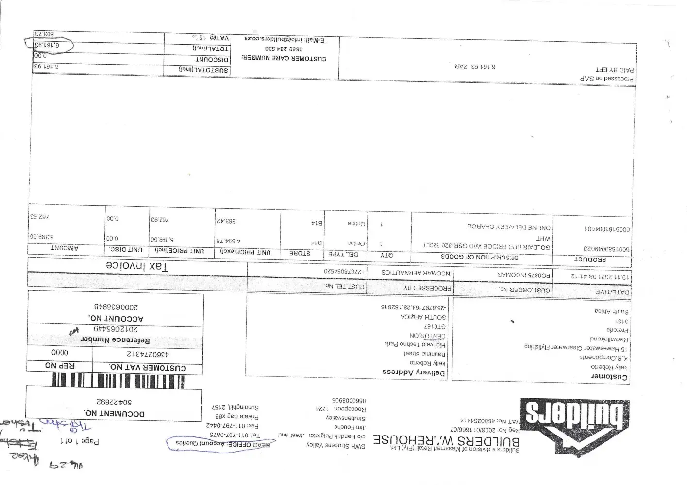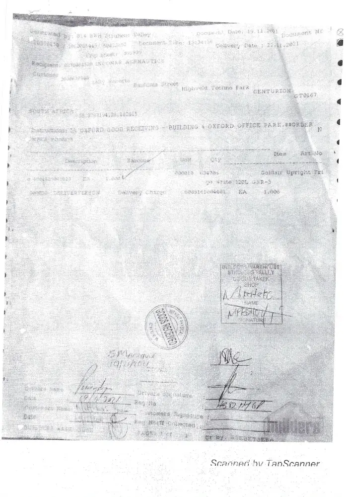 I paced an order for a fridge 18 November. I contact Thishan at Strubensvally on the same day the fridge was delivered 19 November to advise that it was damaged. He did offer a discount and I rejected and asked him to please arrange that it is collected. A week later and it has not been picked up or logged in on your system. I have sent numerous email to info @builders with no response back. Strubensvally had no stock, so I had to purchase the exact fridge again on line from Woodlands.