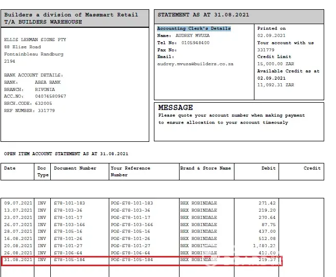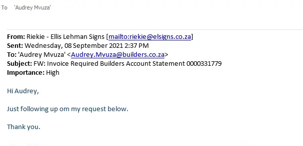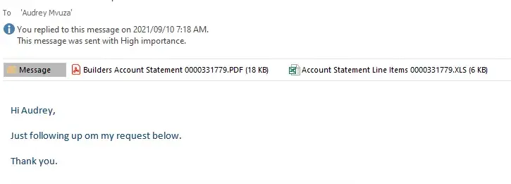 Please see mail send to [protected]@builders.co.za complaint ref no: [protected]