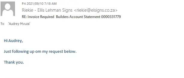 I sent an emails everyday from Friday 02 September up until today 10 September 2021 requesting a copy of an invoice for the debtors department with no response.
