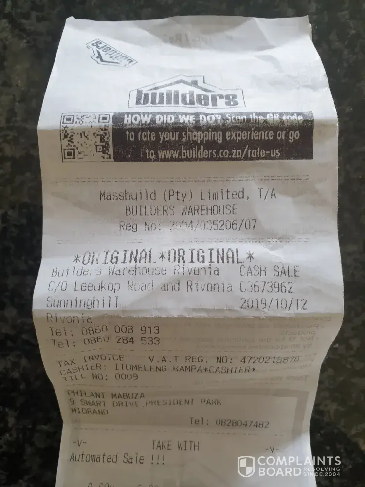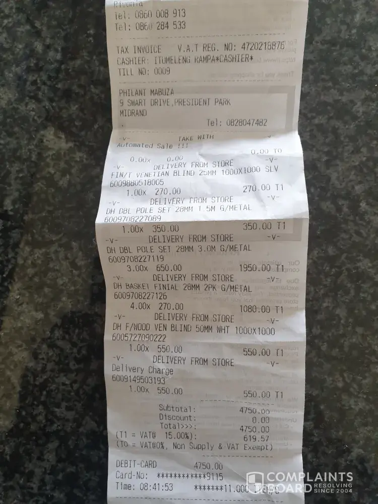 On Sat 12th Oct 2019, I went into the builders warehouse store in Rivonia, made an order for a number of curtain rods and blinds that I needed for a project I had planned for today 19th Oct 2019 @ 10H00.