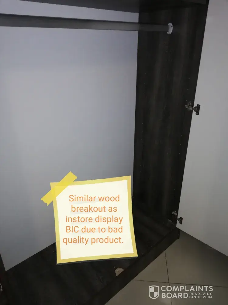 I am disappointed with the cupboards I bought from Builders Warehouse, Parklands on 14 October 2018. This is poor quality and does not belong inside the warehouse to be sell to customers its an indication of poor services. Goods and service that is on the floor should be of good quality as the customer pay for what they want and not the reject cupboards I received after I waisted fuel to get to the warehouse, did a cash sale only to get home and discovered the following: