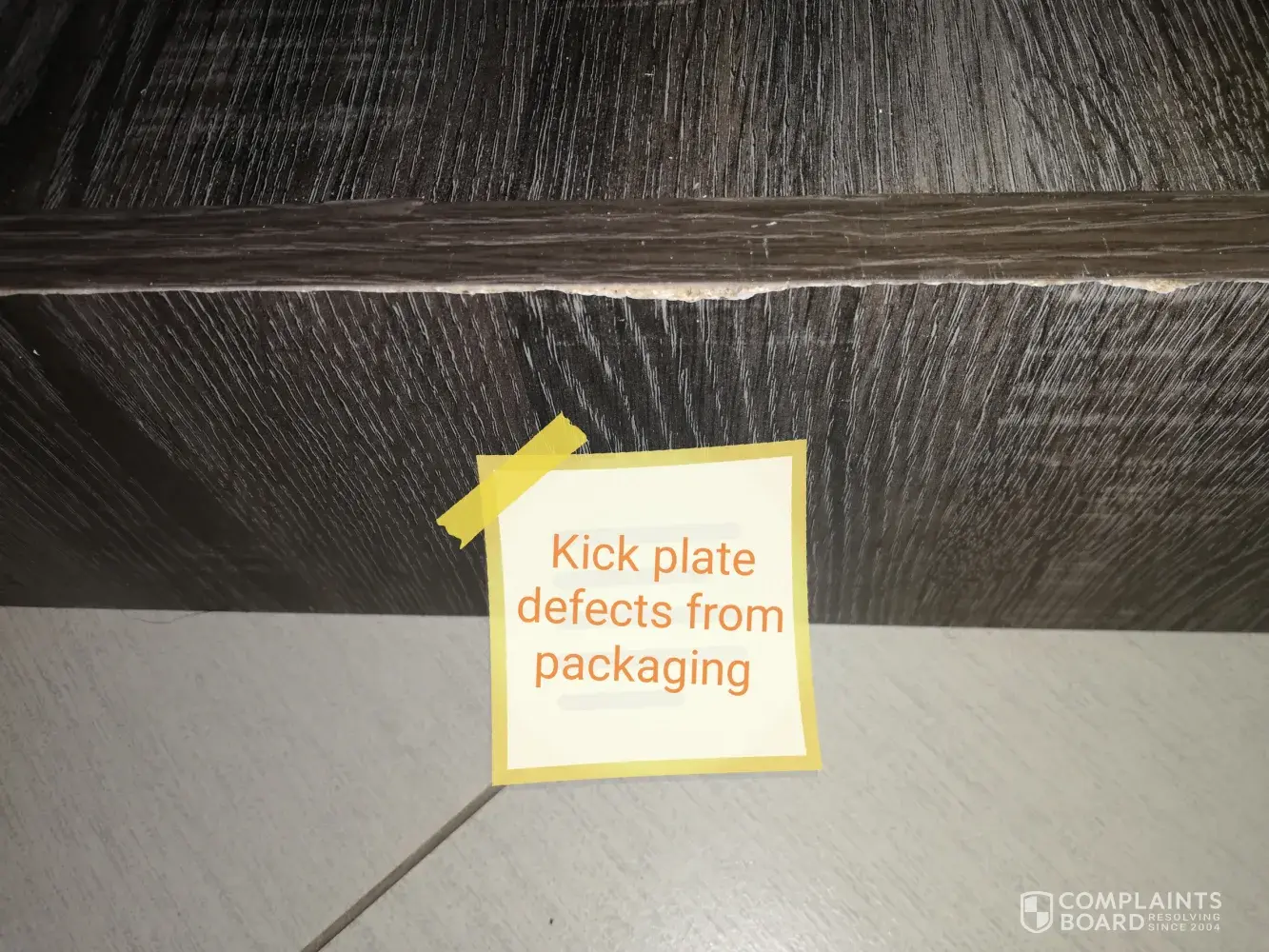 >Gaps still present between side panel, kick plate and fascia due to variable lengths and undersized wood from packaging that does not correspond with the assembly instruction guide provided.