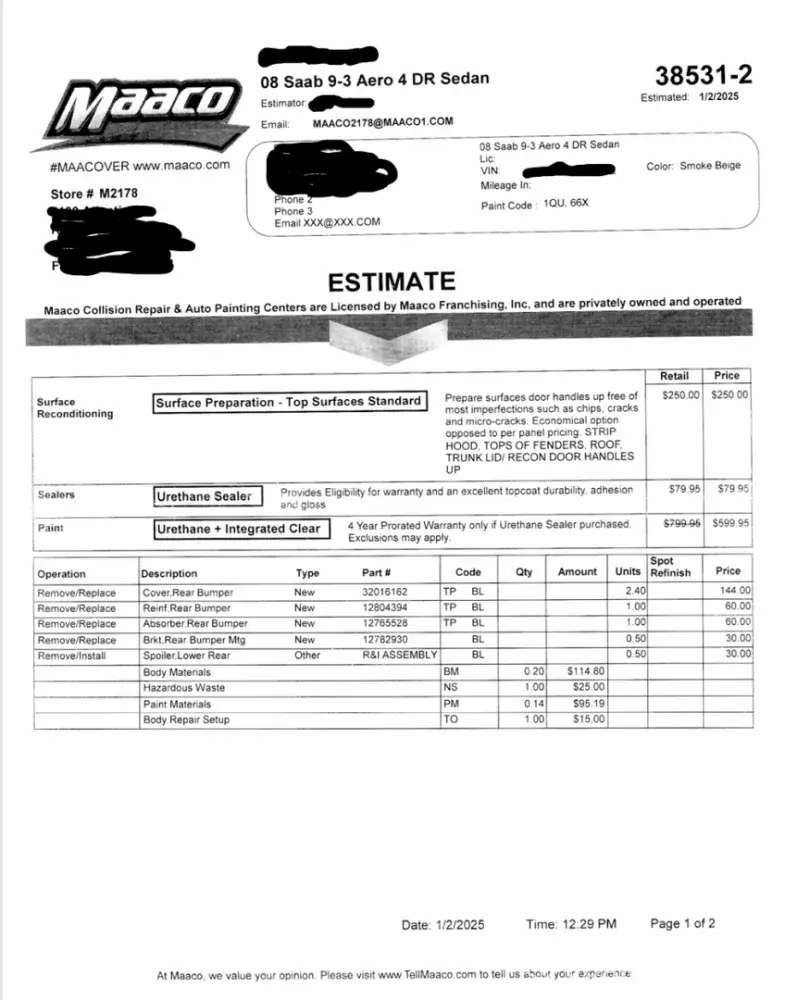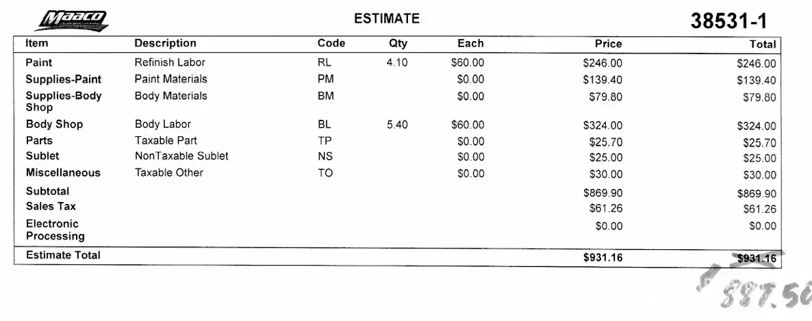 Claimed loss: $524.17 for the bumper.$887.50 for Maaco who removed my old bumper, painted and prepped the wrong bumper, and then reinstalled my old bumper.