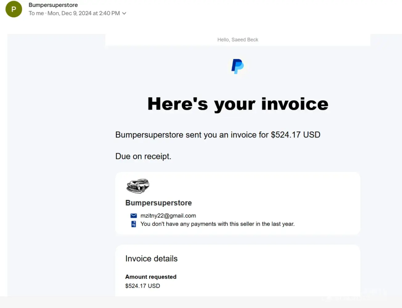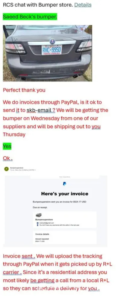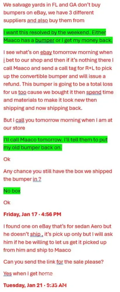 I received texts from Marian Jitney about the bumper. I only have one email from him and that is because it's an invoice separate from ebay. Ebay resolution office has no record of the sale because he uses paypal through email.
