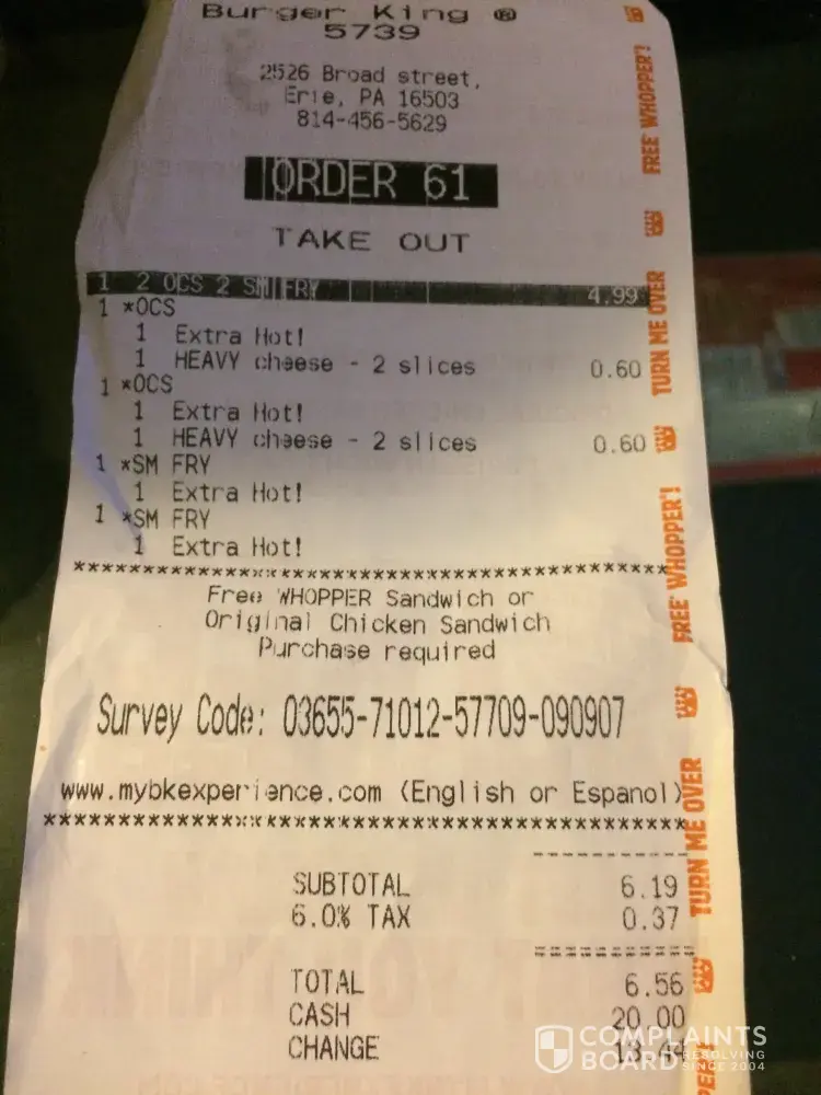 I did the survey for a free whopper and returned to store #[protected] E Ocotillo Rd Chandler, AZ 85249 {[protected]}. I had to purchase a small frie & coke. Order was placed at 10:04am and it took till 10:15am to receive my order.