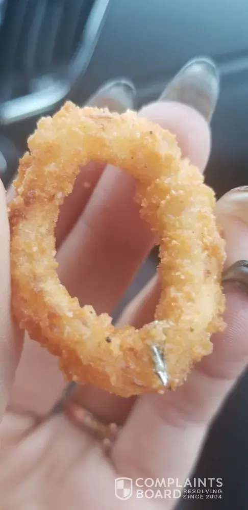 I order 4 combo meals with onion rings on dec 24 2018 at burger king. I was surprise that when I was all most finished my last 2 onion rings there was a sharp piece of metal fried in the onion ring. I am very upset over this and i don't now if i ate any of this metal in the other onion rings. Or if my husband or nephew or his girlfriend had any in there batch. This is something that should not have happened. I will send picture of onion ring with sharp metal fried into it. I could of swallowed this.