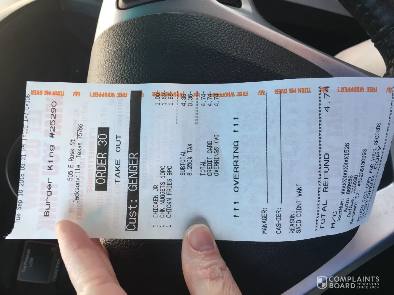 Went through the drive thru with 3 children. Ordered 2 chicken fries meals, 1 kid hamburger meal with juice and a single whopper. The person on the intercom was impossible to hear. Arrived at the first window and given a total of over 21 dollars. I paid. Got to the second window and was given 2 crispy chicken sandwiches and 2 orders of fries and the kid hamburger meal. I knocked on the window to get their attention and they ignored me. I kept knocking until the girl from across the room (not the one standing right at the window) came over. I pointed out the error, she took my receipt and retrieved 2 boxes of chicken fries and thought she was done. To make a long story short, there was no apology given, the manager did not come speak to me although she was clearly standing close enough to offer assistance, and when I asked about the charge a girl went to the back and brought me a $5 bill. The order was still wrong, there was no apology, no sense of iegency and a total lack of empathy. Plenary of apathy however. They couldn't even give me the correct money refund. Please do something about your team. Thank you. Barbara hale. [protected]@gmail.com