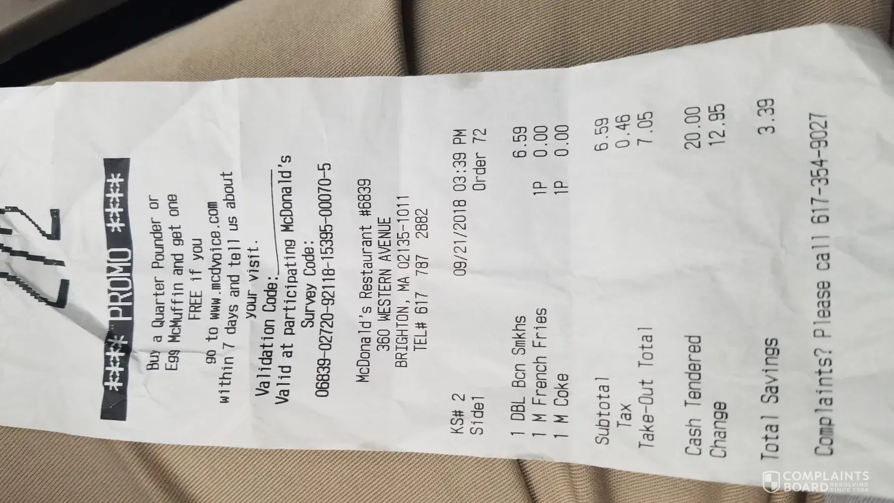 I was at your McDonald's restaurant ( #6839 ) in Brighton, MA today. I got my food ( the Double Bacon Smokehouse burger with the free medium fries/drink promo that McDonald's is running ) and left (to go order). The fries were good as the were fresh and hot, but the disappointment came when I opened the box for the burger and it looked like it had been just thrown in and the box closed (see attached photo). I have also attached a photo of my receipt. I usually have no issues with my orders as I have been there multiple times. Today was just flat out disappointing.