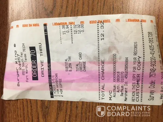 On Wednesday, 8/1/2018 at 1:41:38 PM, at the Burger King restaurant named above, I ordered a Spicy Crispy chicken sandwich and a Whopper with cheese, no pickle, no onion, and a medium soft drink for dine-in. The order was taken by Employee: 17256 Name: Mary on Reg 1 and was labeled IN.