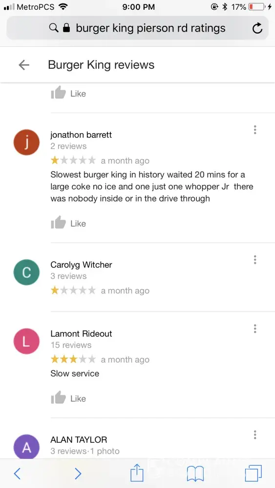 Burger King earns a 1.2-star rating from 27 reviews and 4605 complaints, showing that the majority of fast food enthusiasts are dissatisfied with their meals.