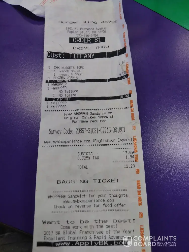 Ordered to go, two whooper with just onions & lettuce got home & guess what, it had everything but the kitchen sink on it. I thru it in the garbage because I am allergic to mayo & don't eat tomatoes or pickles. Thanks a lot Berger king. I did not go back because I had to unpack groceries & I live two far. and it was raining cats & dogs, also the entrance door was jammed for 2 years I even hurt my back when tried to open it. I told the manager finally after two years it was fixed. I always preferred You over McDonald But I think this branch is going down hill. They are also not very friendly. They do not greet you with a smile or an hello. I remember when I used to go there I always was greeted with a smile & a real how are you. Now it's, can I help you, with a look like Y are you here. This branch needs a shake up from the Corp. office. You need to screen your hiring practice better. They want $15.00 an hr. please they are lucky they have a job at all. Can't get a simple order right. Sorry to be so negative but it's the truth. John D.