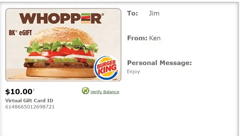 Went to Burger King at 910 Cypress Pkwy, Kissimmee, FL 34759. They said that they could not process my Burger King Gift Card #[protected]. They told me that the only way they could process the gift card is if it were in plastic form. The iGift was a printout from Groupon. The instructions showed that the vendor would need to key in the card number. The manager at the Burger King location said that their system does not allow for numbers to be keyed in, that it had to be in plastic form so they could swipe it.