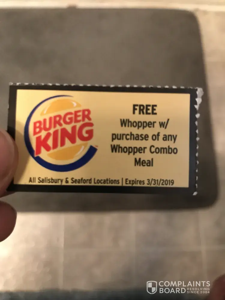 I bought a coupon book from a local fundraiser from a school. The coupon states free whopper w/ purchase of any whopper combo meal and I ordered a whopper jr combo meal and told them I had the coupon at the drive through. When I pulled up to the window they ask for the coupon and then told me the amount for my food and I said why is it so much they then said well you wanted the free whopper so we added a whopper combo meal. I told them the coupon said free w any whopper combo meal and they it means a big whopper so after several minutes I just paid for a extra meal to get the whopper when I shouldn't have had to.
