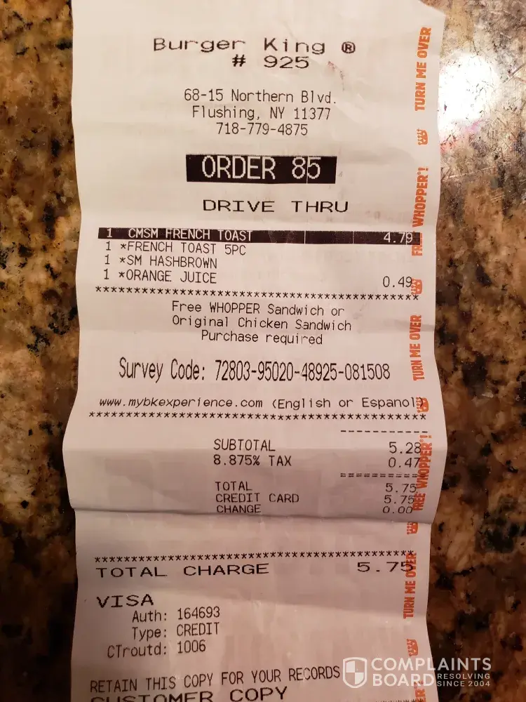 Burger King on south parkway Huntsville Al, I didn't get receipt because I got a refund When we ordered we were the only people in the building. A lady came in behind us ordered and left, we still hadn't got our order. when we asked if there was a problem they said it was shift change, and still didn't have our food. I asked for my money back. There were five employees in the back and two in front at the register There is no excuse for this kind of service.