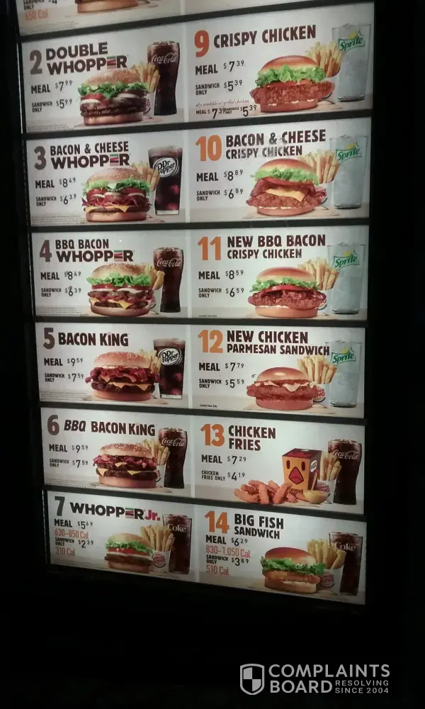 Burger King at 2802 Concord Pike, Wilmington, DE 19803 used FALSE advertising for the Chicken Parm sandwich. They have a sign posted at the drive-thru for all the public to see, listing the sandwich for $5.59, but overcharge at the window for $5.79. They refused to honor the sign, so I took my business to your competitor, McDonald's, where the price they post is what the public pays. In the attached photo of the signboard at the drive -thru, Meal 12 is the item being marketed deceptively . Not a good look for your organization to not honor what is advertised, the old bait and switch.