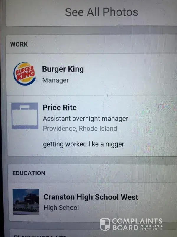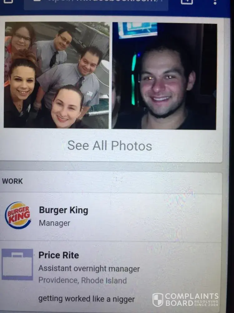 Hello thank you for taking the time to read into this matter, me and my fiance have dined at bk countless times due to our fast last lifestyle with work so it accomidates us well. We recently stumbled on one of your managers Facebook profiles where underneath his job description says"working like a n[censor]" this manager is in the rhode island area of providence his name is micheal Lonardo. He has multiple pictures with him in his BK uniform. Me and my fiance find this extremely vulgar, racist and unethical. Me as a veteran of the army have served along side all races colors shapes and sizes and seing such hate and racism in his Facebook sickens us. I have taken pictures of the post along with his name and picture. We believe such racism should not be allowed in your company, there are hard workers all shapes and colors providing for families. Me and fiance believe he should be fired immediately to prevent spreading any further hate, we refuse to eat in an establishment where racism would be looked over, as well as anyone who sees this picture and post. This is why we are immediately bringing it to your attention. You may reach me personally threw email or my contact info is [protected]. We hope this gentleman will be immediately removed from the company so we feel safe again to bring our daughter into your resturaunts. Best regards William Brissette