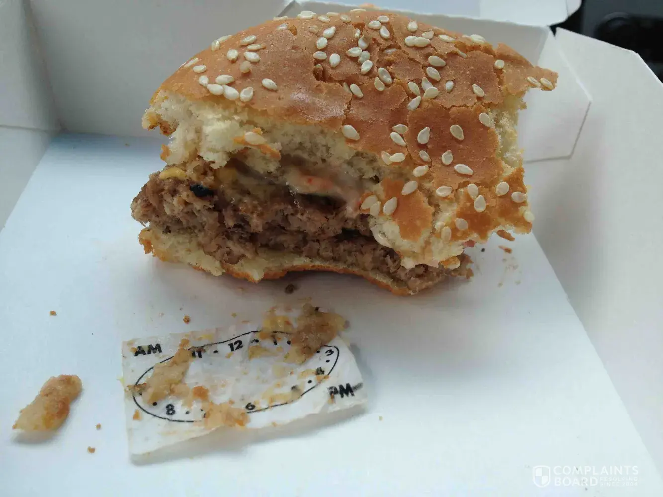 There was literally a one by one piece of paper inside of my Double Whopper from Burger King! After eating more than half of my sandwich, I came across this piece of trash that was inside of the meat. The piece of paper has what looks like a clock on it. What a disgusting lunch! I filed a complaint, and I expect a refund and compensation for any illness that may come of it!
