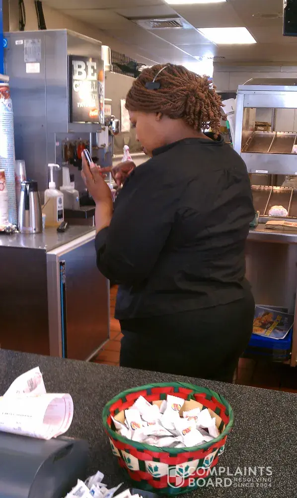 During the busy lunch rush, I waited at the counter for my order (#18) while this woman texted. My food was done and in the staging area. I waited a total of five minutes while this lady texted and/or facebooked on her phone. She laughed and was pointing at the phone while showing others.