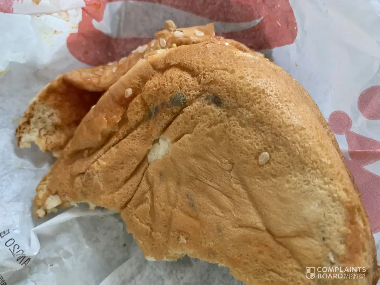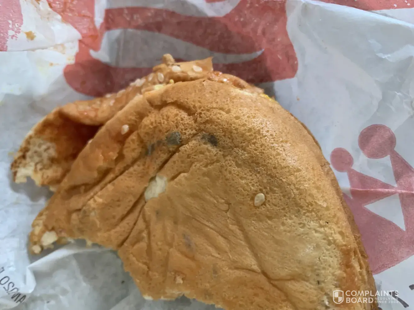 On Wed., 1/6/22, I ordered two bacon cheeseburgers and a chicken sandwich. I had to wait, according to the ticket, 19 minutes before I got my order to my car. This is not the complaint. I realize with the ignorance of Covid-19, this may be the new normal. But my bread was moldy, only noticing after I ate half the food. This is not the new norm.