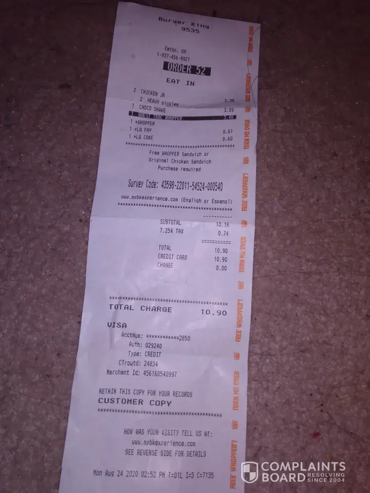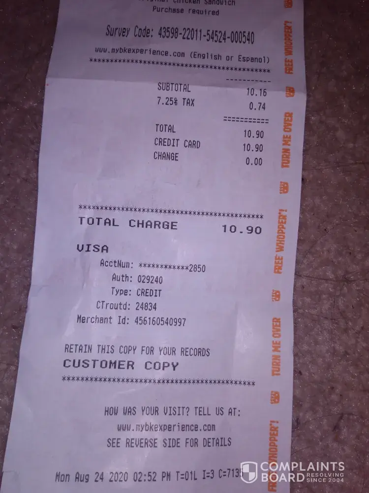 To whom it may concern, I noticed on my receipt that I was charged $3.48 for a Whopper..I had completed a survey for a free Whopper and it was not subtracted. Plus the cashier did not give me the larger coke which I thought was packaged up too. Is there any chance I can get the money back for the overcharge? Thank you very much. Pictures attached. [protected]@live.com