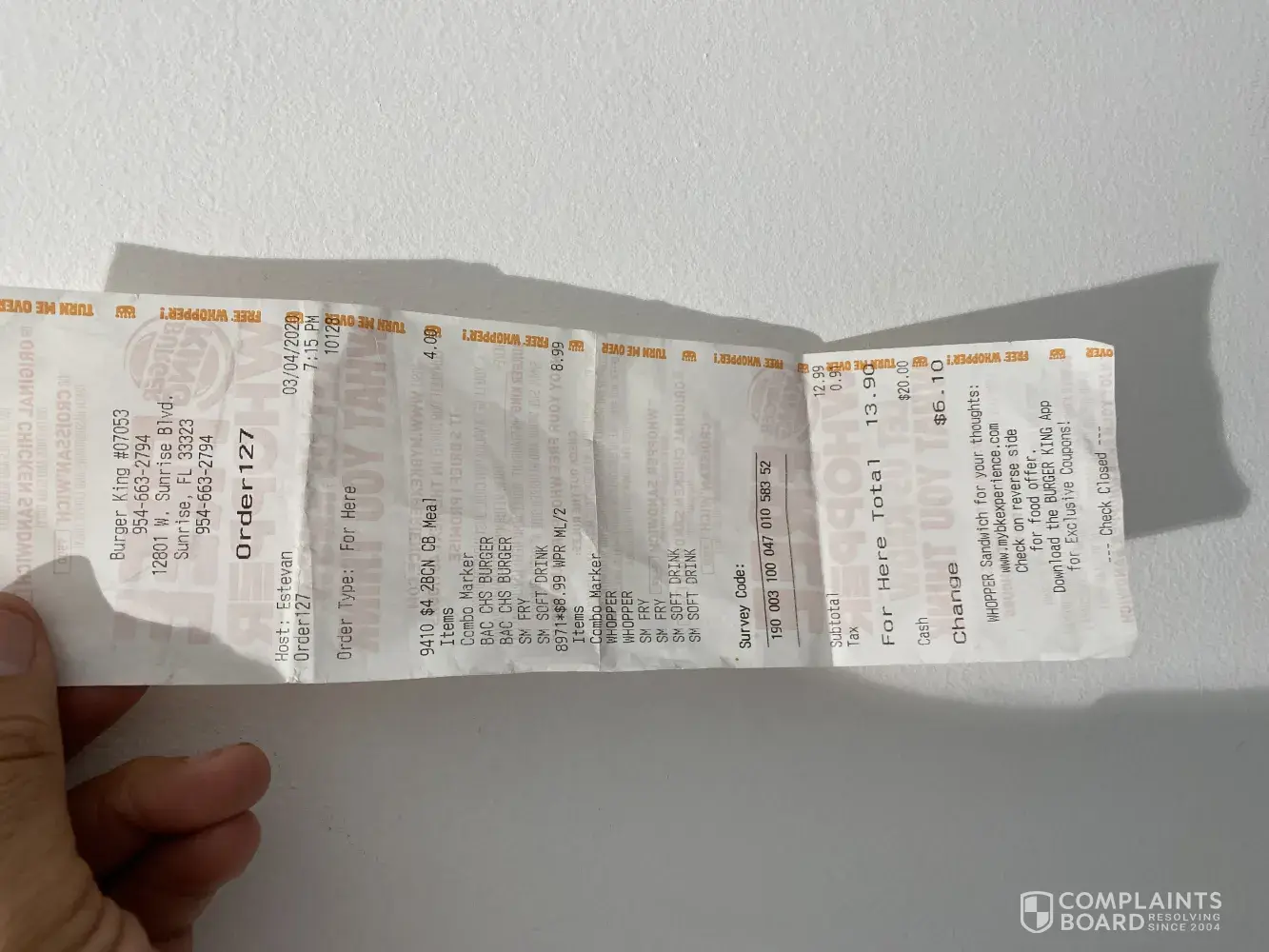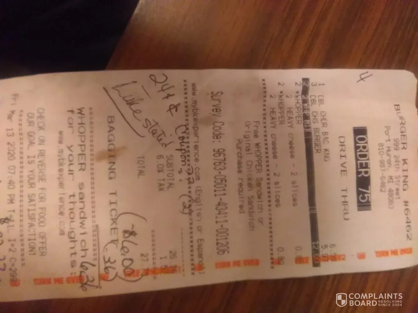 On march 04/2020 i purchased 2 bac chs burgers and 2 whoppers combo right after the purchase my coworker felt sick on his meal a while after finishing eating the bac chs burgers and i started getting sick on my stomach arround 11:00pm all this on the same day of the puechase, arround 11:45pm i decided to go to a 24 hours wallgreens near my house and i...