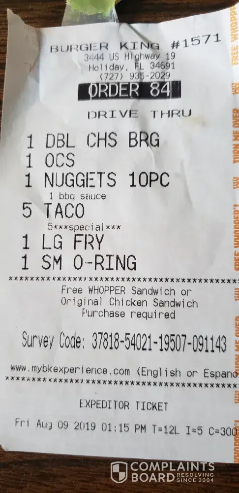I have never complained before but I went to the burger king on 6319 US 19 in New Port Richey and placed an order which when getting home was missing 2 original chicken sandwiches needless to say very upset and swore would never go to that burger king again. So a week later placed order #84 now at 3444 US 19 in holiday and was missing the double cheeseburger in that order. I own several businesses and it does not seem that hard to get a fast food order correct. Have never had a McDonald's or Wendy's order messed up. Your tacos are very good but the service is horrible.