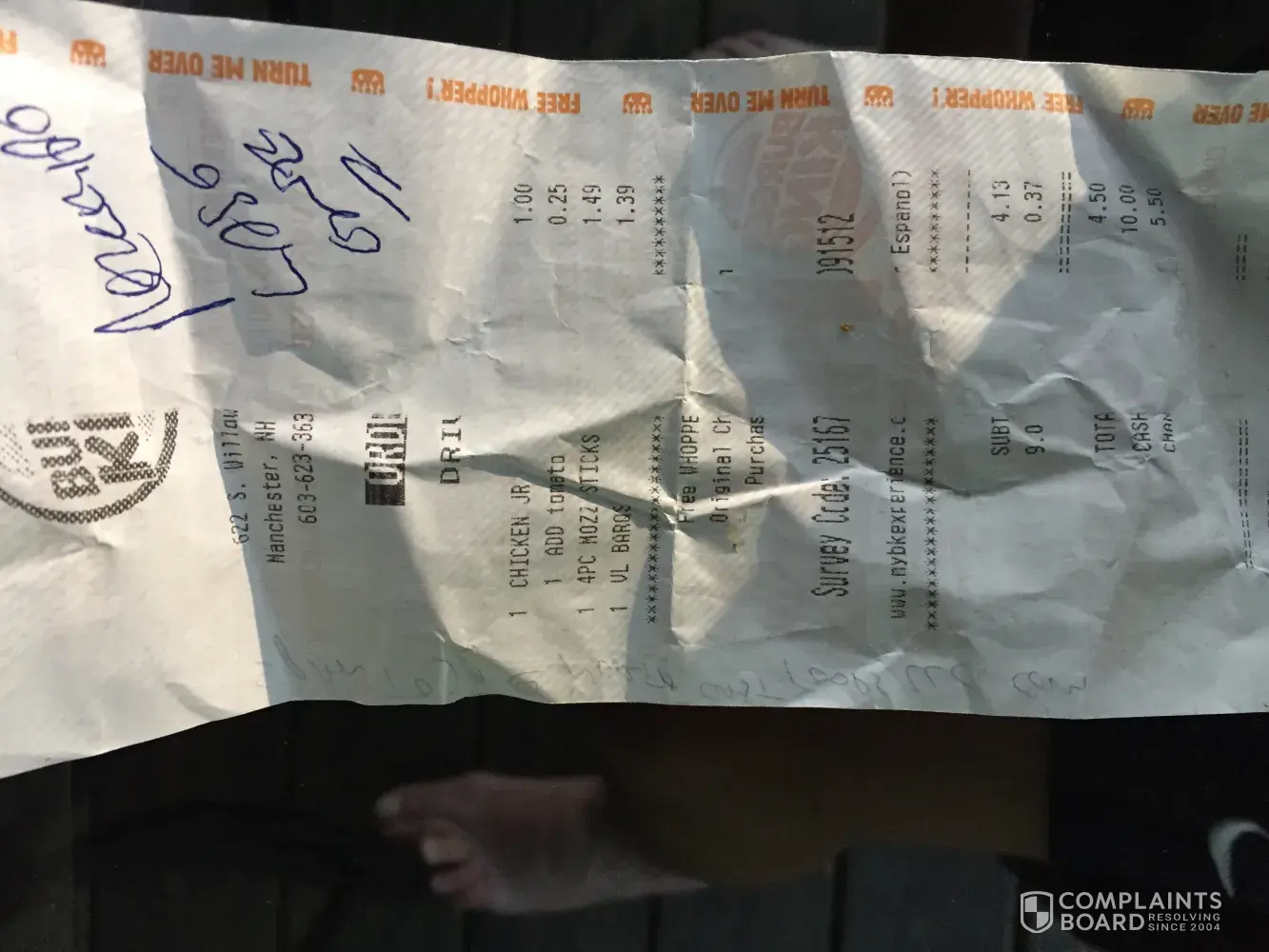 I think it's more of a complaint about the restaurant it's personnel and unprofessionalism I arrived around 1215 pm and it seemed like the personnel people were in chaos I ordered my things I asked for a receipt they said oh this is the last one they took the receipt roll of paper from the order machine and put it in the to go machine I asked about an opinion about one of the chicken items since they said no whoppers or meats since they were not able to cook because the grill was down and the comment was from the employee that he wouldn't even feed it to his dog. I don't expect this will go anywhere, because I'm sure there's numerous complaints about that location.