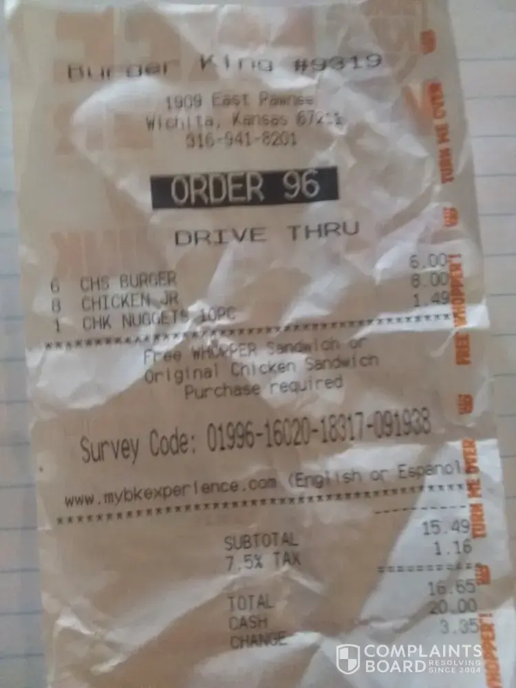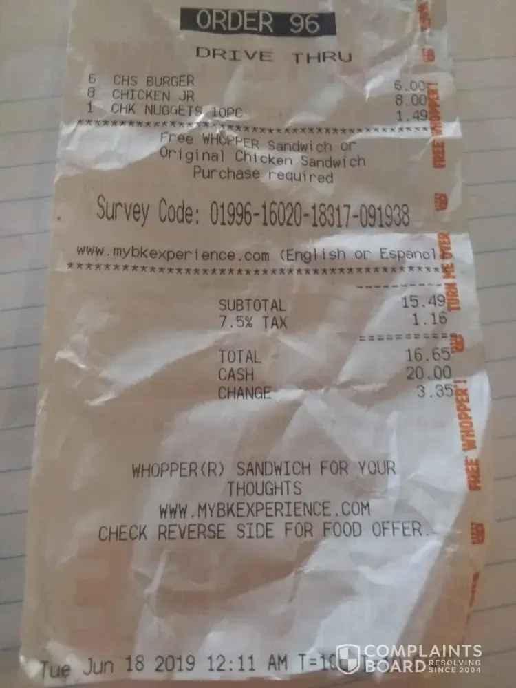 On June 18th, 2019 at 12:11am my order # was "96". I went through your drivethru and placed my of 6, cheeseburgers, 8 chicken jr's, and 1 10 piece chicken nuggets w/ honey mustard for my sauce. I drove up to the window and paid, $16.65. After receiving my change I was then asked to please pull up by the side door and please wait for my food. I did as I wa...