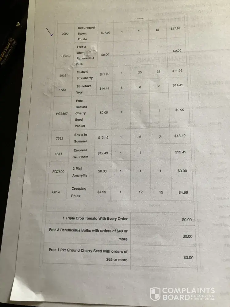 See above attached complaint Order mailed with check on March 24. Have not received any of our plants or seeds. Today is May 17. No one answers their phone continuously busy. No response back to multiple emails sent. Want full refund back now that planting season is in effect
