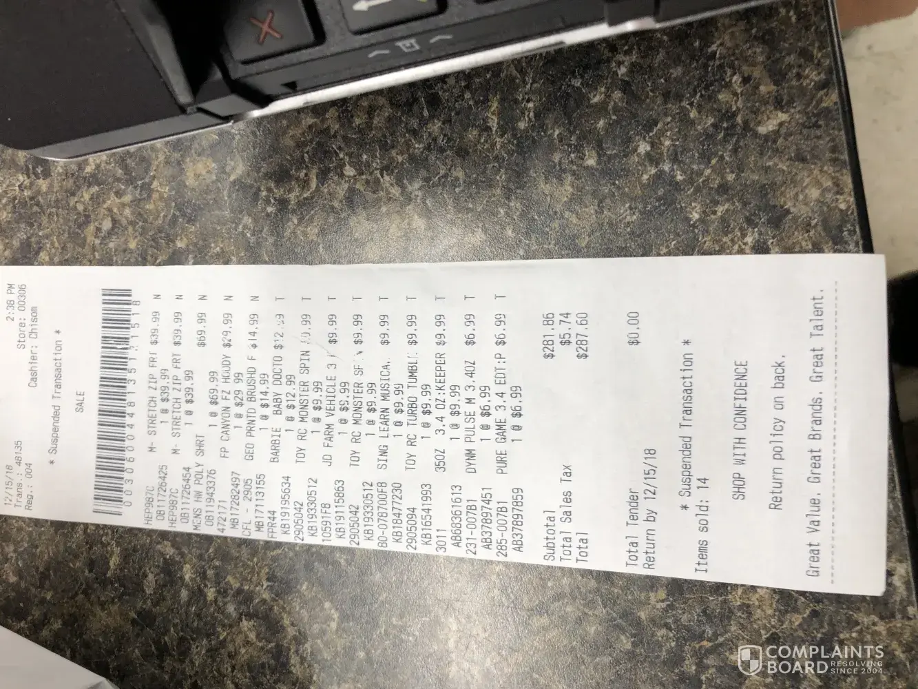 Good Evening: This complaint refers to Store #00344, Transaction #52574, 8:37 pm, Register 004, Cashier: Fariha, on Friday, May 10, 2019: I purchased five items: 2 pairs of mens pants, 1 pair of suspenders, 1 tie, and 1 tie with a pocket square ($8.99). When my son and I left the store, we went straight to my car and went home. Once we got home, we...