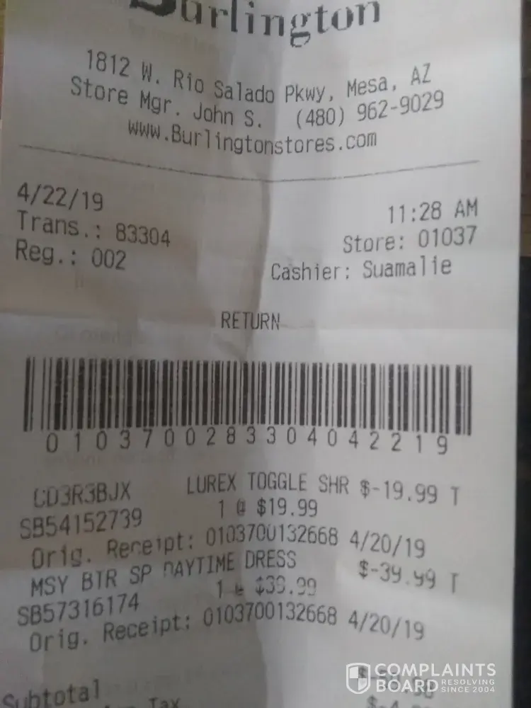 On 4/21/19 I went to Burlington store # 01037 and purchased a dress and sweater. Once I made it home I was not happy with the fit. On 4/22/19 I returned the items to the store. At first, I was told that I would have to receive a store credit. I informed the associate that this unacceptable especially since the item was purchased on a credit card. She then advised that it was her only option on her screen. (she seemed new) She called for help. 2 other associates came to help her and showed her to simply touch a line on the screen and she was then able to issue a credit card credit...so I thought. Today is 5/3/19, I am still waiting on this refund to my credit card. I have been going back and forth with customer service trying to locate my refund. My bank shows nothing even submitted to be pending. I have sent the refund receipt...still waiting. I will never shop Burlington again.